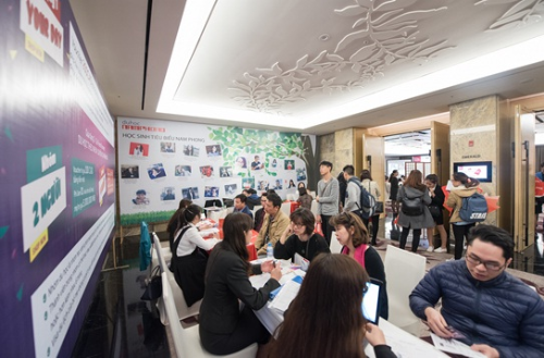Nhiều học sinh đã tự mang hồ sơ đến chương trình để đăng ký trực tiếp với đại diện các trường và xin học bổng.